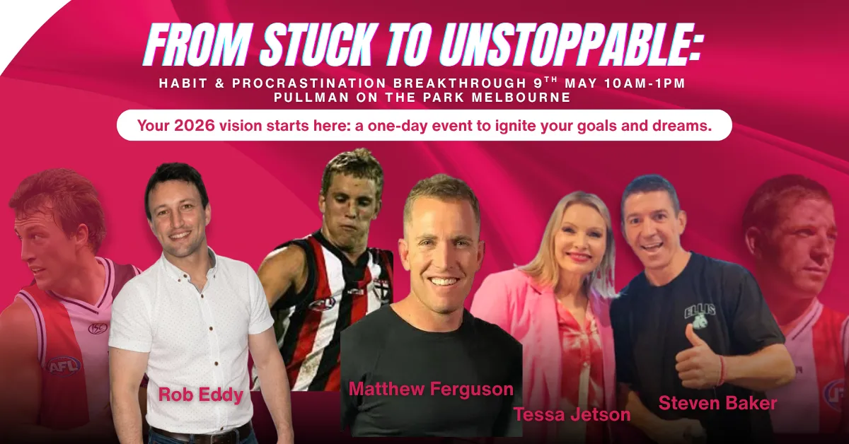By the end of the day, you won’t just be inspired — you’ll have a personalised Action Plan that you can start using immediately. You’ll walk out feeling lighter, sharper, and more excited for life than you’ve felt in years, knowing exactly how to get your goals moving — and the tools to make sure you follow through, no matter what.